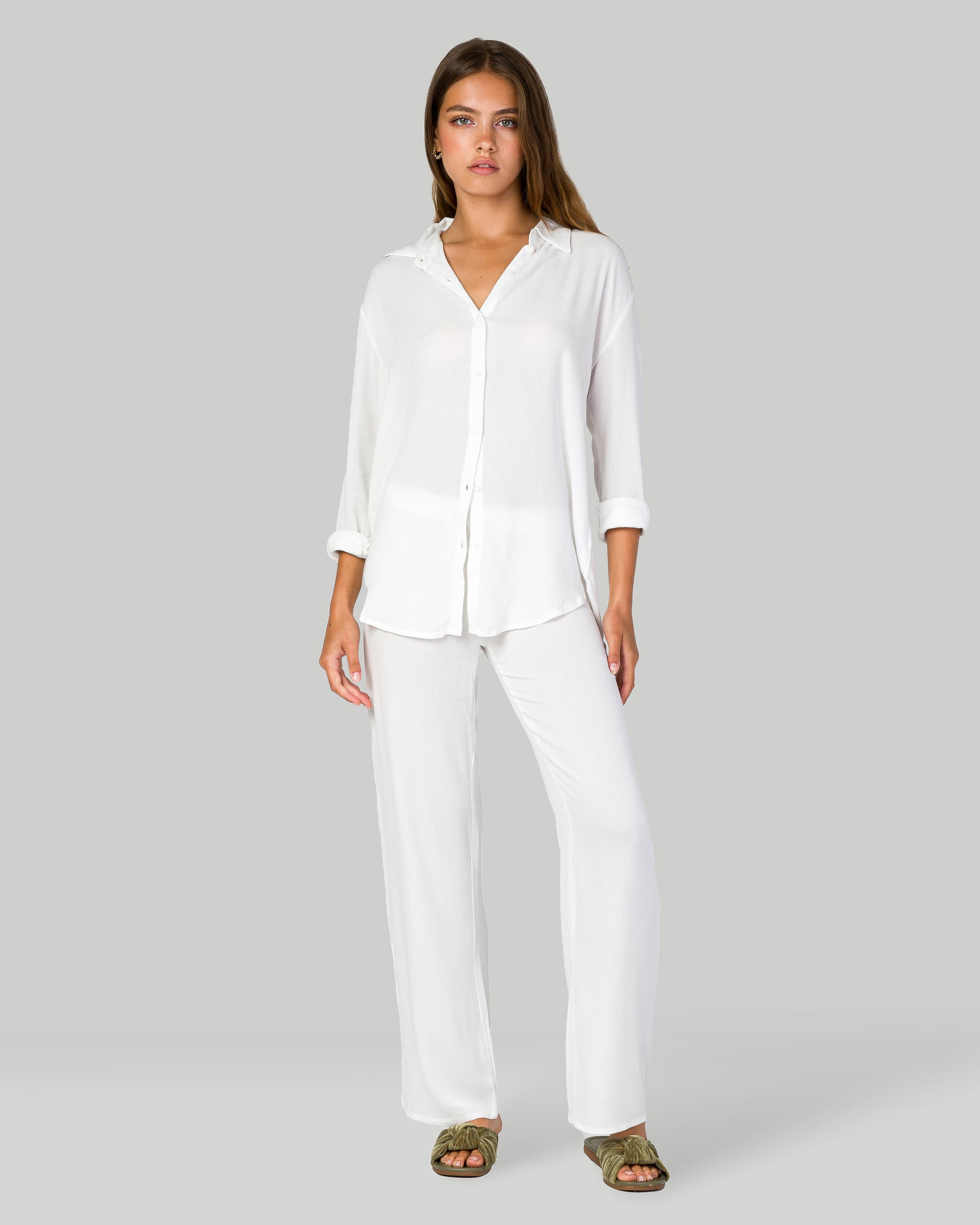 The Flowy Oversized Shirt captures the essence of laid-back luxury, perfect for those sun-drenched days by the coast. Crafted from lightweight rayon, this long sleeve button-up drapes effortlessly over your frame, offering a chic oversized fit that exudes a relaxed yet sophisticated vibe. Ideal for layering over your favorite swimwear or pairing with the matching Flowy Wide Leg Pant.